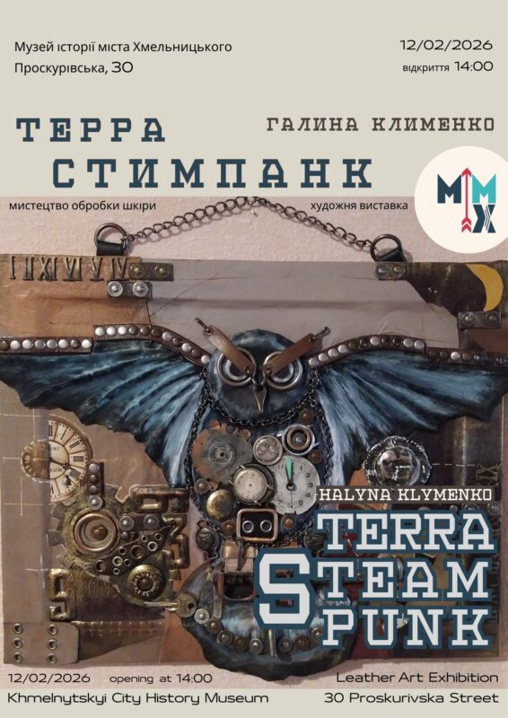 Музей історії міста Хмельницького запрошує хмельничан і гостей міста на відкриття виставки художньої обробки шкіри Галини Клименко «Терра Стимпанк» – об’ємного мистецтва, в якому авторка тяжіє до втілення власного уявного всесвіту за допомогою комбінативності найрізноманітніших природних і технічних матеріалів.